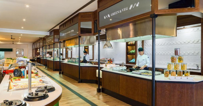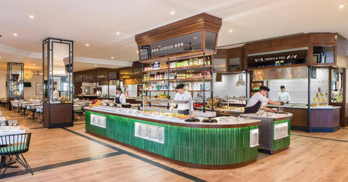 Cele 2 restaurante tip bufet oferă bucătărie deschisă și seri tematice. Printre localurile à la carte se numără The Steakhouse, care servește specialități americane, Dolce Vita, care oferă preparate din bucătăria italiană, și Sakura, cu specific oriental. Oaspeții pot savura o băutură la Piano Bar, Sports Bar, Mike's Coffee sau la barul de langă zonă, La Choza.