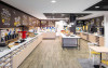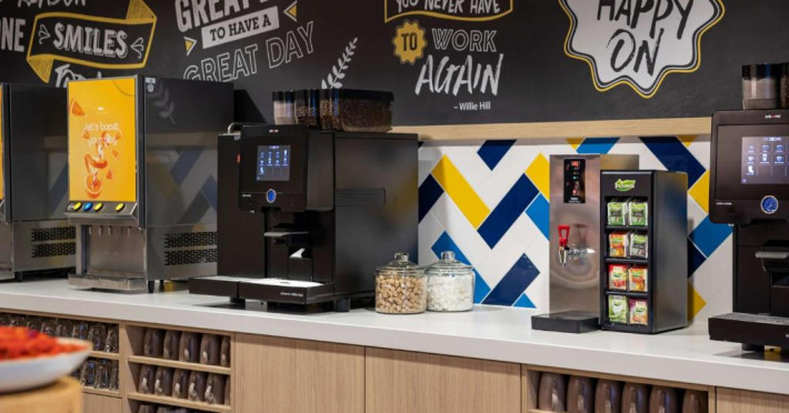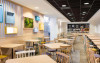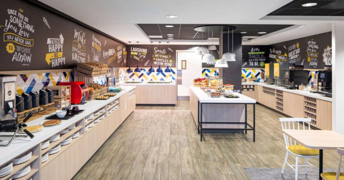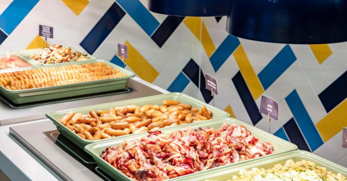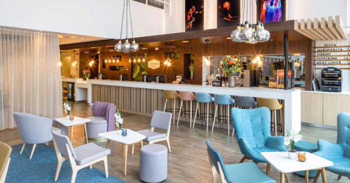 Barul din hol oferă diverse băuturi și pizza, iar oaspeții pot lua masa la unul dintre restaurantele aflate in zonă inconjurătoare.