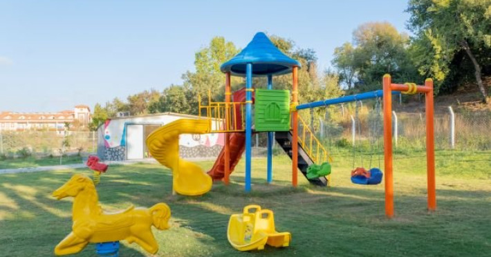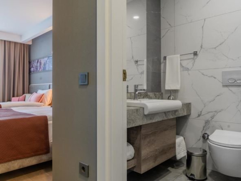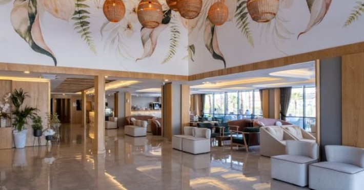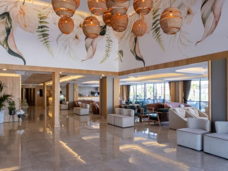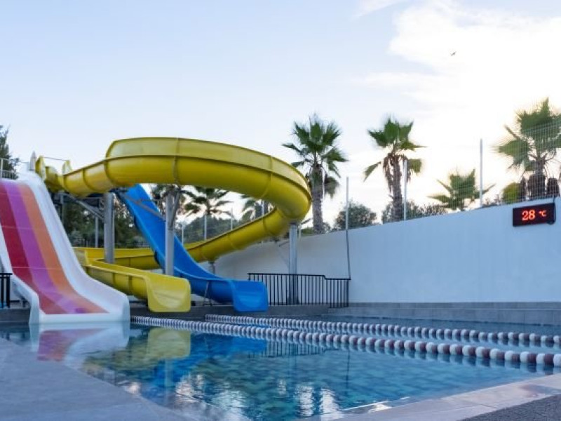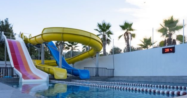 Facilitati hotel: Oaspetii pot beneficia de restaurant principal, restaurant A la Carte, baruri, piscina exterioara, piscina interioara, sezlonguri si umbrele, centru spa, programe de animatie, tenis de masa, darts, aerobic, centru fitness, gradina, teren volley, piscina pentru copii, miniclub, tobogane, parcare, parc acvatic, terasa, receptie 24h, bar pe plaja.