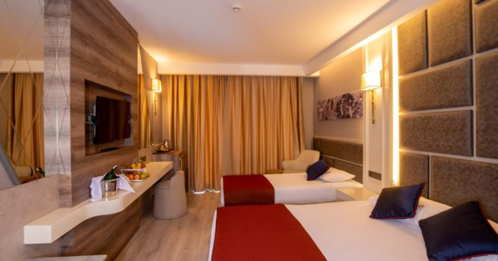 Amplasată în Side (Antalya), această locație de 5 stele oferă o plajă privată, o piscină interioară și una exterioară, cu șezlonguri și umbrele de soare. Experiența de vacanță este de neuitat datorită facilităților care îmbrățișează spiritul mediteranean și culorile oferite de peisajul natural.Facilități camere