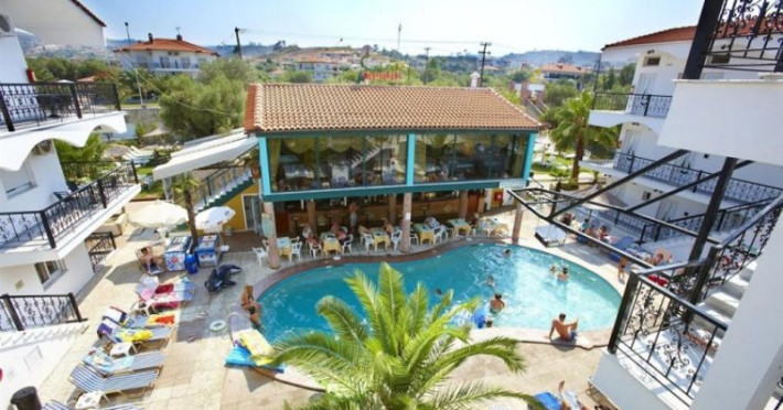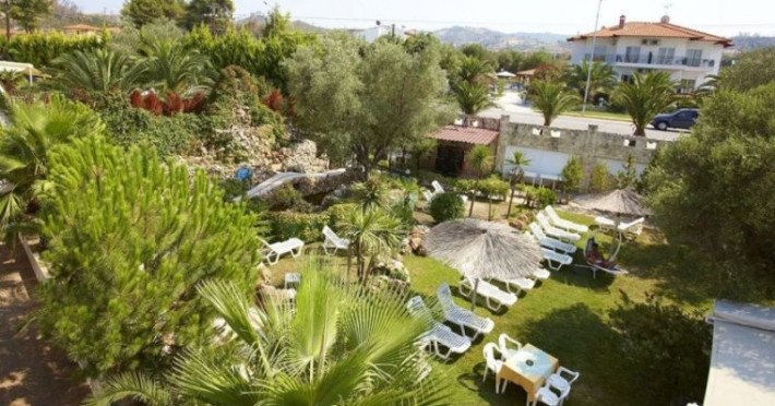 Situat pe bratul Kassandra in statiunea Hanioti la o distanta de 300 de m de plaja, si 80 de km fata de aeroportul international "Makedonia" din Salonic.