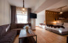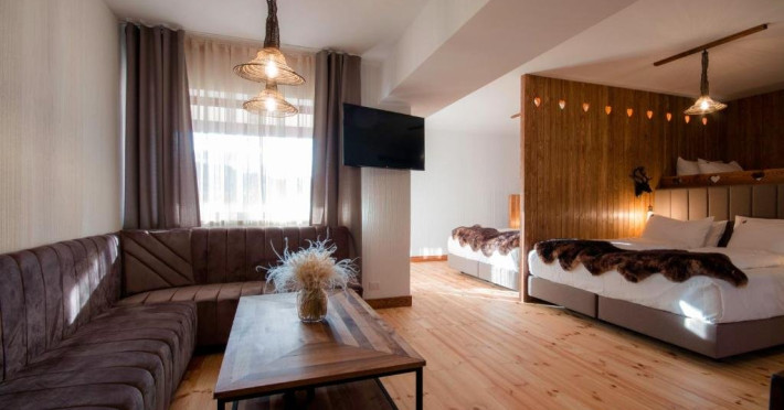 Studio Dublu Deluxe, cu o suprafata de aproximativ 56 mp, are 2 camere, pat matrimonial, canapea extensibila si 2 bai, ofera Wi-Fi gratuit, aer conditionat, acces la facilitati spa, balcon privat spatios cu vedere panoramica asupra Campulungului.