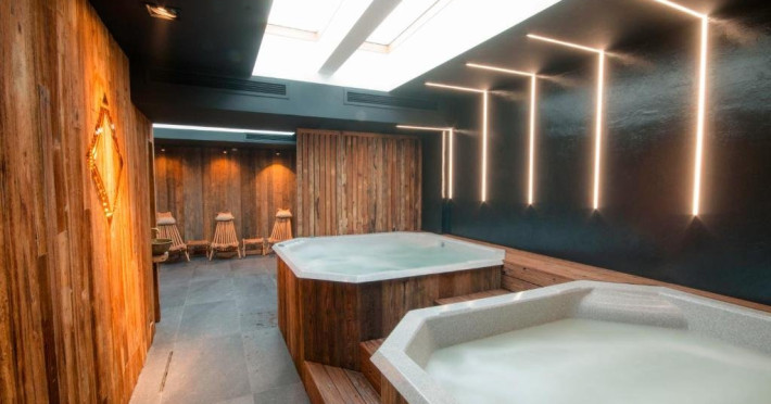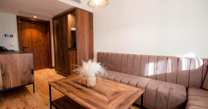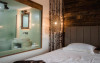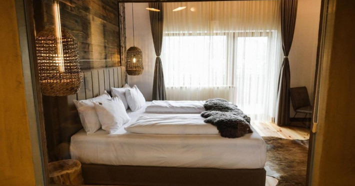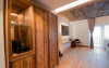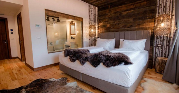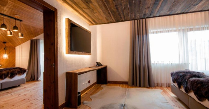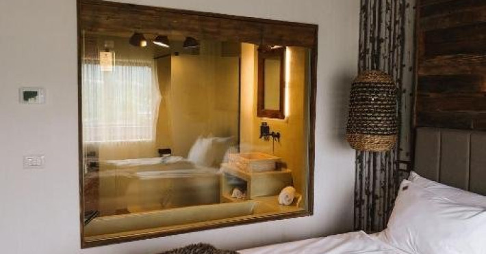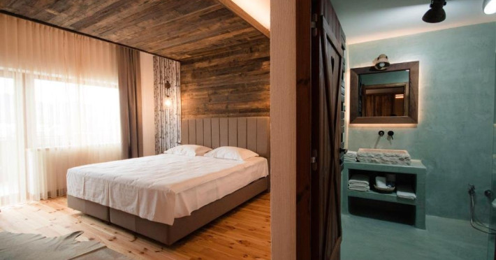 Camera dubla Deluxe cu cada, cu o suprafata de aproximativ 46 mp, cu pat matrimonial si baie cu geam si vedere catre camera. Ofera Wi-Fi gratuit, aer conditionat, TV, masina de cafea si acces la facilitati spa. Balcon privat spatios cu vedere panoramica asupra Campulungului, ideal pentru relaxare in cadru montan.