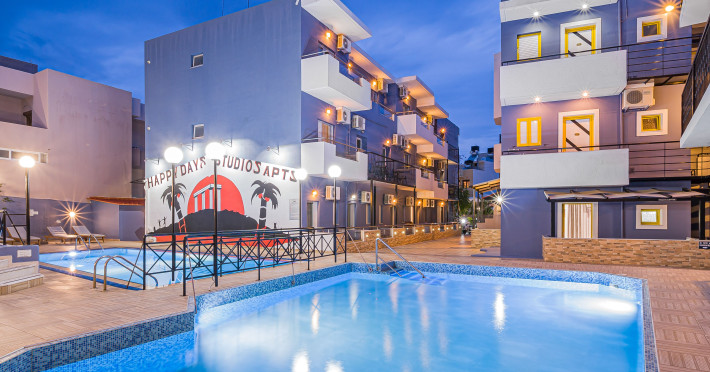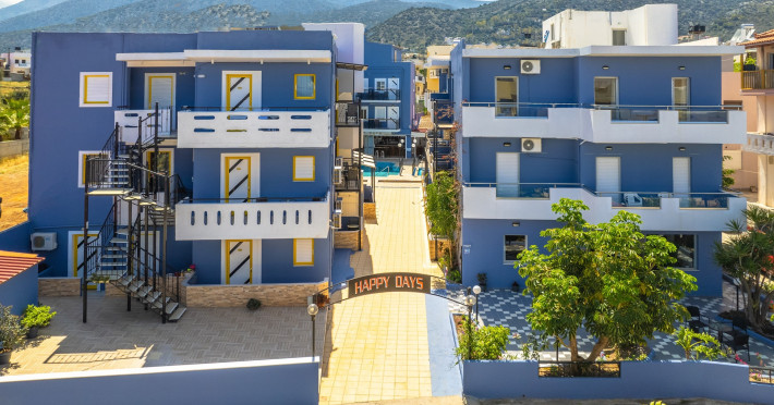 Happy Days Studios is located in the beautiful old town of Malia, only 1,5 km from the sandy beach. All Studios and apartments are well equipped to ensure a comfortable stay. The hotel facilities and the friendly personnel will guarantee you an unforgettable stay. **Reception hours: From 09:00 until 00:00Happy Days Studios is located in the beautiful old town of Malia, only 1,5 km from the sandy beach. All Studios and apartments are well equipped to ensure a comfortable stay. The hotel facilities and the friendly personnel will guarantee you an unforgettable stay. **Reception hours: From 09:00 until 00:00