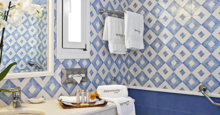 Sunt disponibile 22 camere. Unele camere au balcon cu vedere la mare sau la grădină. Camerele de la Harmony Boutique sunt dotate cu aer condiționat, Tv cu canale prin satelit și seif. În camere există baie cu cadă sau duș ce are în dotare foehn și articole de toaletă gratuite. Fiecare cameră dispune de minibar și cană-fierbător. Oaspeții pot solicita serviciul de room service pentru a servi masa sau diverse băuturi. Oaspeții au acces gratuit la serviciul Wi-fi în camere. Curățenia in cameră se face zilnic. Anumite camere au zonă de relaxare și cadă cu hidromasaj care asigură un plus de confort și răsfăț. Proprietatea oferă camere pentru nefumători.