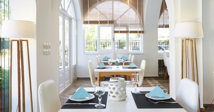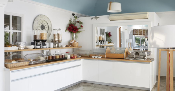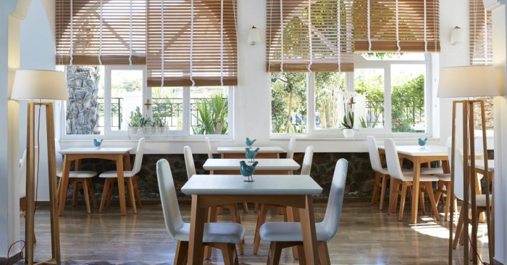 La Hermes oaspeții au la dispoziție un restaurant care servește mâncare à la carte. Preparate din bucătăria grecească și internațională așteaptă să fie degustate în fiecare zi la micul dejun, prânz și cină. Masa poate fi servită atât în interior, cît si în aer liber, pe terasă, în funcție de vreme. Oaspeţii pot avea diverse băuturi răcoritoare sau alcoolice la bar. În cadrul proprietății există și un snack bar care servește băuturi și gustări. Pentru cei cu anumite nevoi de nutriție, Hermes oferă meniuri pentru diete speciale.
