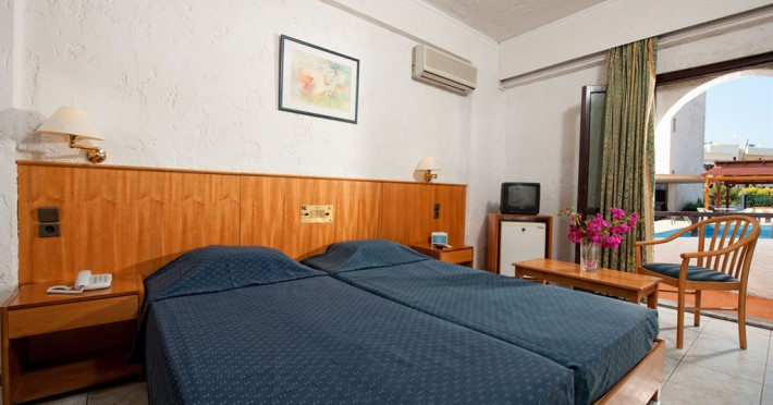 Sunt disponibile 129 camere. În camere există baie cu cadă sau duș, foehn, articole de toaletă gratuite, precum și halate de baie și papuci. Unele camere au balcon cu vedere la mare sau la piscină. Camerele de la Heronissos Hotel sunt dotate cu aer condiționat, Tv cu canale prin satelit și seif. Fiecare cameră oferă cană-fierbător și mașină pentru prepare cafea sau ceai. Oaspeții pot solicita serviciul de room service pentru a servi masa sau diverse băuturi. Curățenia in cameră se face zilnic. Fiecare unitate de cazare are frigider. Proprietatea oferă camere pentru nefumători.