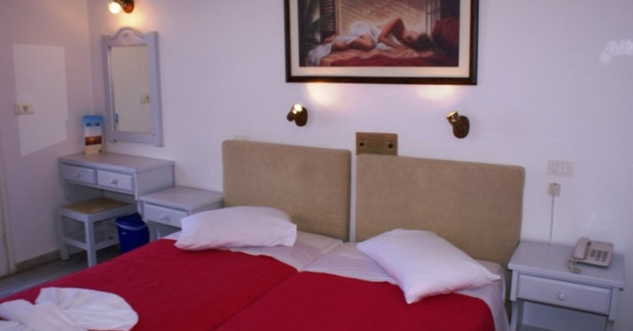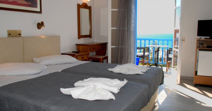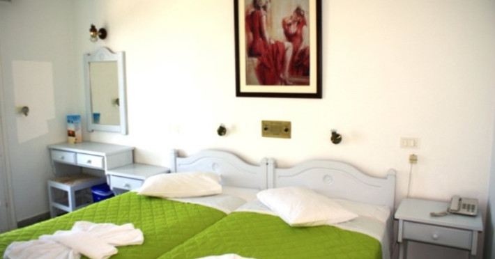 Hotelul are 34 de camere (camere cu 2 locuri cu posibilitatea de a adauga pat suplimentar, camere triple sau camere cu 4 locuri). Acestea au balcon sau verande mari cu vedere la mare sau la piscina si dispun de baie privata cu dus/ cada si uscator de par, aer conditionat/ sistem de incalzire, TV prin satelit si muzica cu 2 canale, telefon cu linie direct, frigider si Wi-fi.