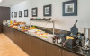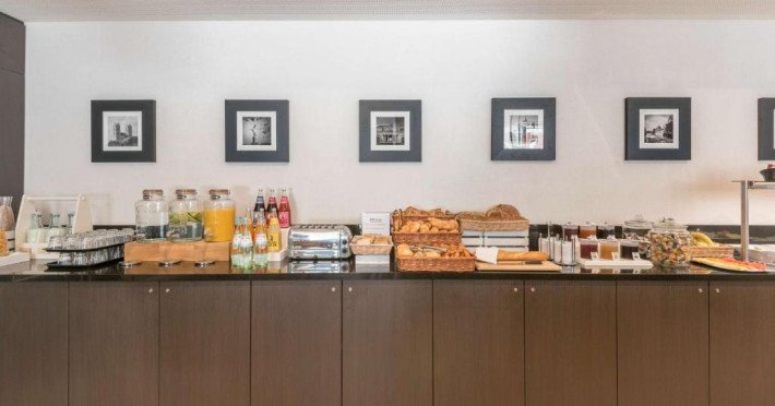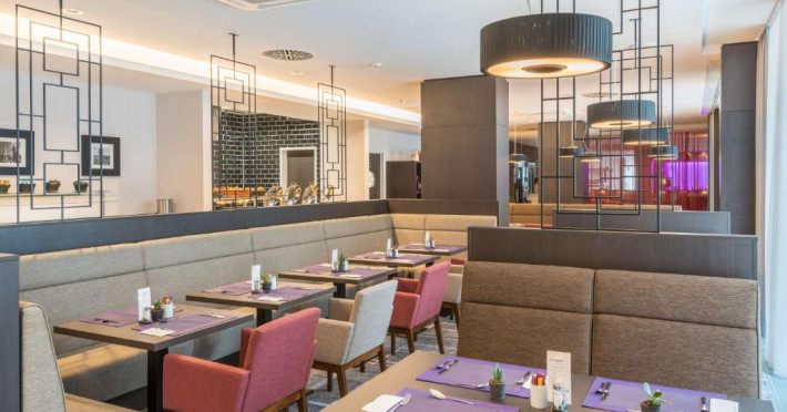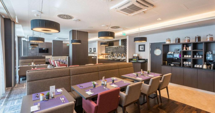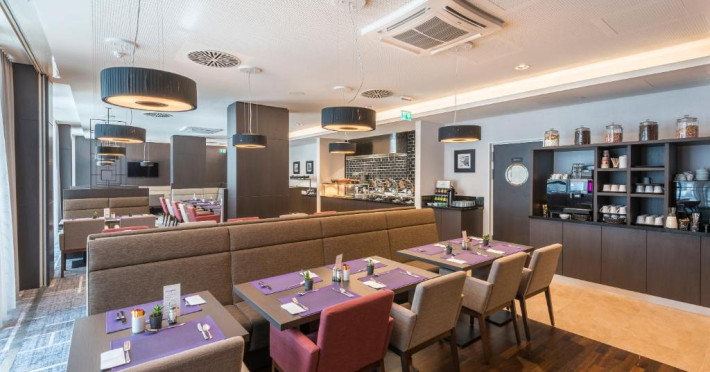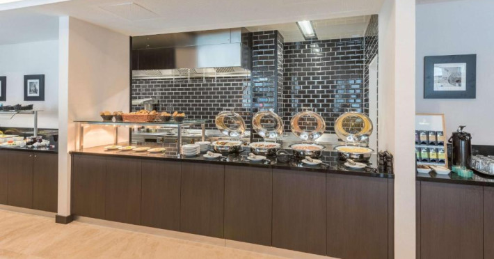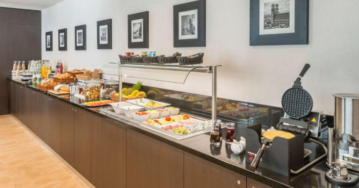Proprietatea servește zilnic un mic dejun tip bufet, continental sau englezesc/irlandez complet. Hilton Garden Inn Munich City West are un restaurant care servește mancăruri din bucătăria internațională. La cerere, sunt disponibile și preparate vegetariene, fără lactate și vegane.