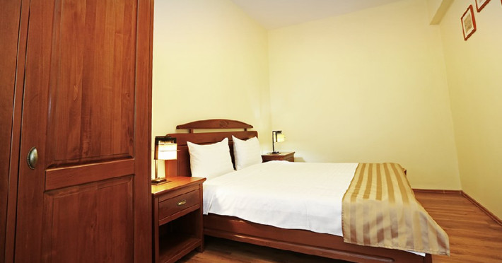 - Apartament (suprafata totala 46 mp), compus din camera cu un pat dublu matrimonial (1600/1900), o camera cu 2 paturi twin (900/1900) si o canapea extensibila si baie. Numarul maxim de persoane admise este 4 adulti si un copil sub12 ani. Spatiul nu permite instalarea unui pat suplimentar,
