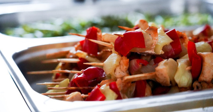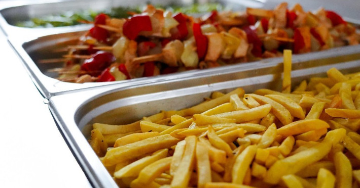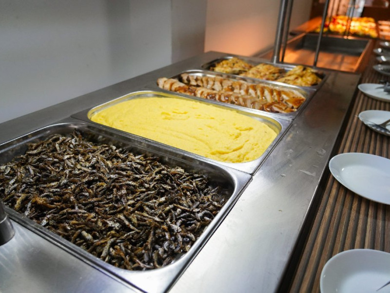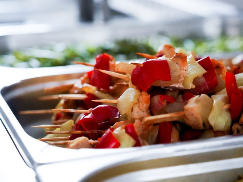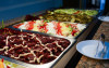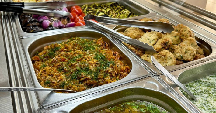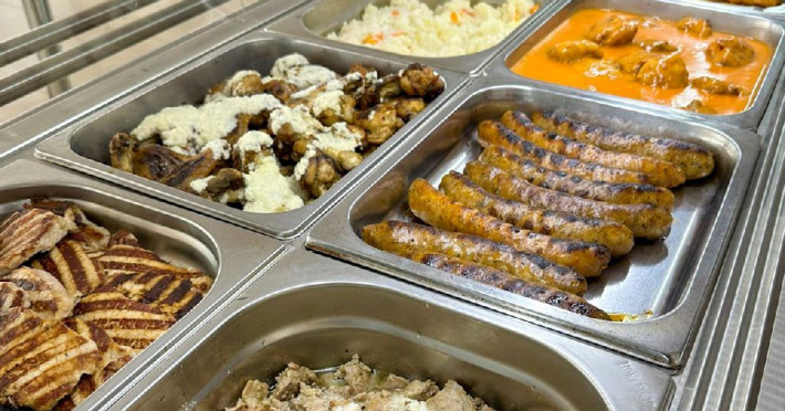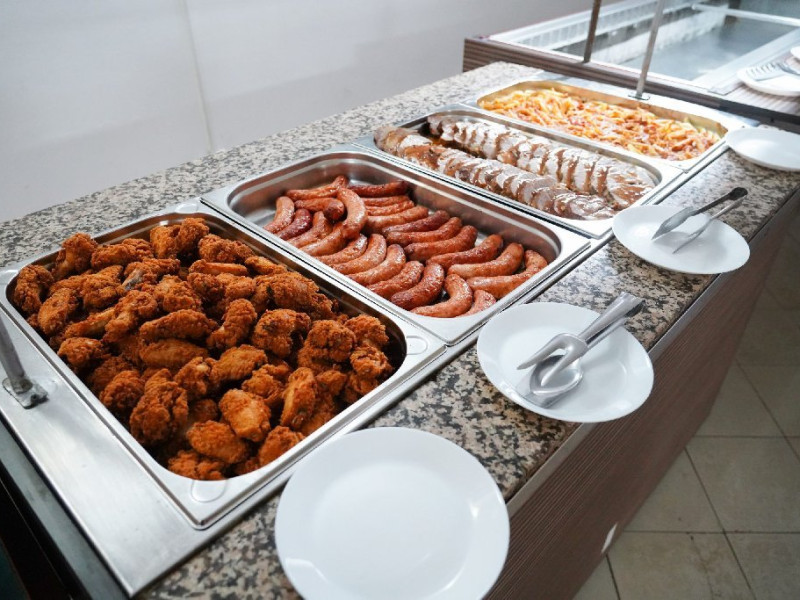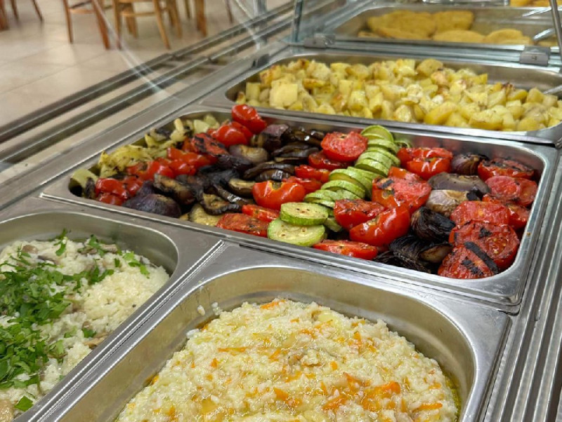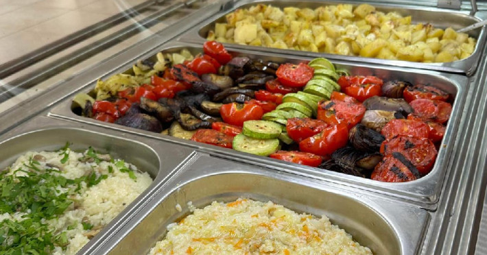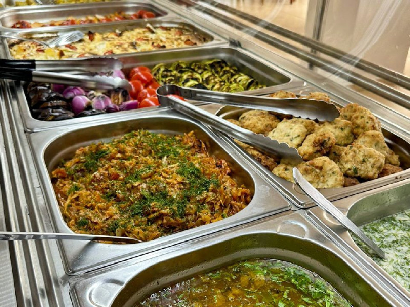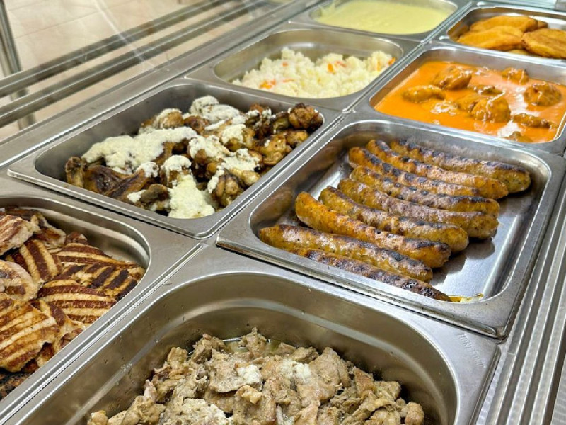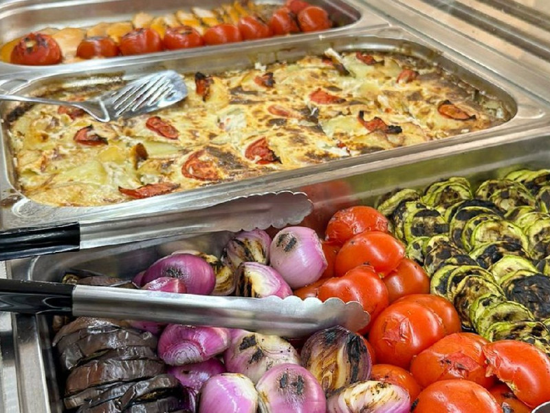 Bufet de preparate gatite (aproximativ 6 feluri): ardei umpluti, musaca, tochitura dobrograna, cotlet impanat, vinete umplute, noodles, chiftele marinate, gulas, tigaie picanta, mazare, varza, pui la cuptor, samd.