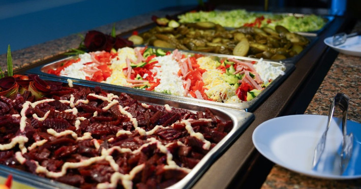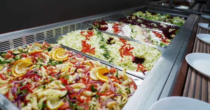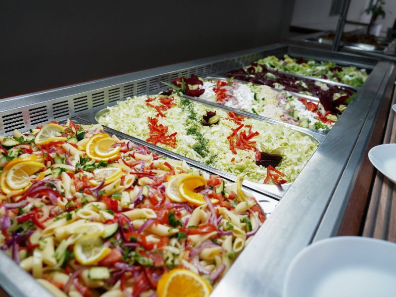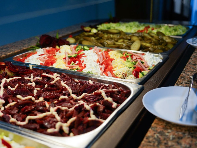 Bufet de salate (aproximativ 6 tipuri): salate de vara, salate cu ton, sfecla rosie, muraturi, salata verde, samd.