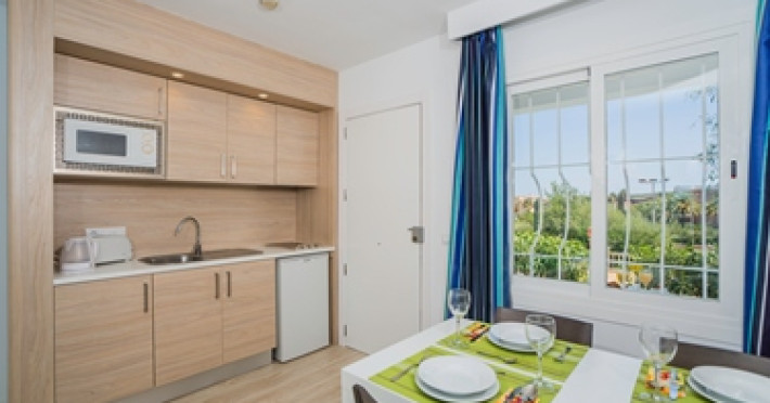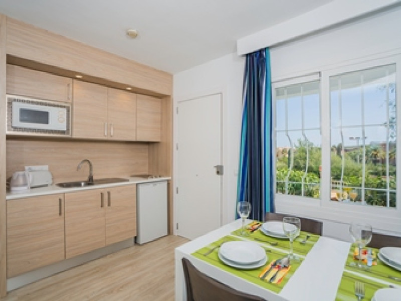 Around 400 m from a beach lies the apart hotel Holiday Center Santa Ponsa. The beach is patrolled by a lifeguard. Here, there are beach towels for a fee available. The air-conditioned hotel is equipped with a 24h reception (check-in is possible around the clock), a lobby, Wi-Fi, a shop, cash machine, showers and changing rooms, a first aid kit, parking spaces as well as a TV lounge with satellite TV. In the outdoor area of the property you will find a garden as well as a pool that is open seasonally (open all year), where you can rent pool towels for a fee and sun loungers and sun umbrellas are available for free. For children there is also a children's pool with a children`s slide. Furthermore, outside you can find a sun terrace. You can store your valuables in the safe (extra fee), and your luggage in the hotel`s storage roomn. For very young guests, kid`s chairs, highchairs and cots can be provided. For the smallest children prams can be rented in the hotel. There is also a laundry and ironing service. For your comfort there is a concierge service. If necessary, you can contact the medical centre at any time. Guests at the accommodation can get a wake-up call from the hotel personnel. If you want to explore the holiday region, you can use the car and motorbike rental service close to the hotel. At the hotel reception, tickets are offered for excursions in the area. Due to its barrier-free facilities , such as barrier-free entrances, wheelchair accessible rooms and wheelchair-accessible bathrooms, the hotel is also suitable for wheelchair users. Catering As catering services the hotel offers breakfast only and self-catering. Breakfast is offered continental or from the buffet. For the meals, there are a restaurant (gluten-free dishes) and a bar, the cafeteria as well as the pool bar. Sports & Leisure If you want to stay on the ball during your holidays, you`ll find the chance to play football. During your holiday you can also take part in aerobics courses. There is also the option to play billiards. Those who want to practice archery will find facilities for this at the hotel. With table football, table tennis and volleyball various other sports offer a lot of variety on holiday. For cyclists there is a bicycle rental as well as a storage room. Infants can be looked after in the hotel`s own baby club. For older children the care takes place in the children`s club. Junior hotel guests can also let off steam in the mini disco. In terms of adult entertainment, shows are organized in the evening and there is a games room available to use. Some of the sports are already included in the price. Additional information The hotel has a total of 120 rooms.