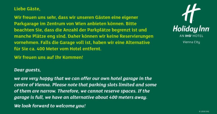 Situat intr-o zonă la modă a Vienei, dar in afara traseelor turistice bătute și la 450 de metri de următoarea stație de metrou, Holiday Inn Vienna City, administrat de o familie, are o curte interioară luxuriantă cu zonă de luat masa și un restaurant care servește preparate din bucătăria tipic austriacă. Este disponibil WiFi gratuit in toate zonele.