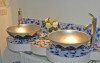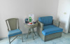 Micul dejun tip bufet, cu fructe proaspete și prăjituri de casă, este servit pe terasă.