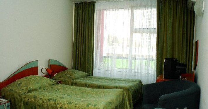 Camere: Hotelul are 269 de camere duble si 14 apartamente. Spatiile de cazare sunt prevazute cu aer conditionat, TV, minibar, telefon, baie cu dus, uscator de par si balcon. Apartamentele sunt formate din living cu canapea extensibila si dormitor cu pat matrimonial, hol si baie. Toate apartamentele sunt dotate cu aer conditionat (in living), minibar (in living), telefon, TV cu televiziune prin cablu (in living), geam termopan, baie cu cabina de dus, uscator de par, balcon si pardoseala acoperita cu mocheta.
