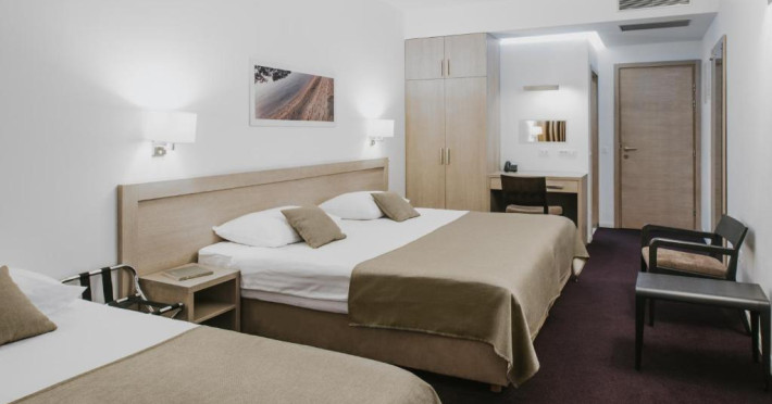 Fiecare cameră a Hotelului Adrian este dotată cu aer condiționat și TV cu ecran plat și canale prin satelit. Pereții sunt pictați intr-o nuanță deschisă de mocha, perdelele sunt albe, iar băile spațioase au plăci bej și mocha.