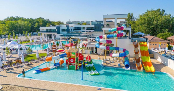 Parc acvatic cu trei piscine si tobogane, teren multisport pentru fotbal, baschet, tenis de camp.
