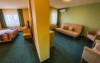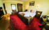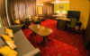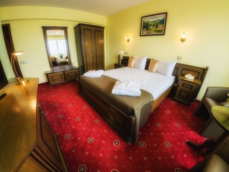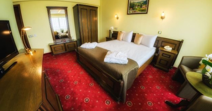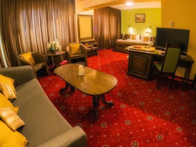 Junior Suite 4 stele: au 50 mp sunt formate dintr-un spatiu cu pat matrimonial, canapea extensibila, balcon, minibar, birou de lucru, telefon, tv, aer conditionat, seif, baie cu cada hidromasaj, uscator de par, halate de baie si papuci.