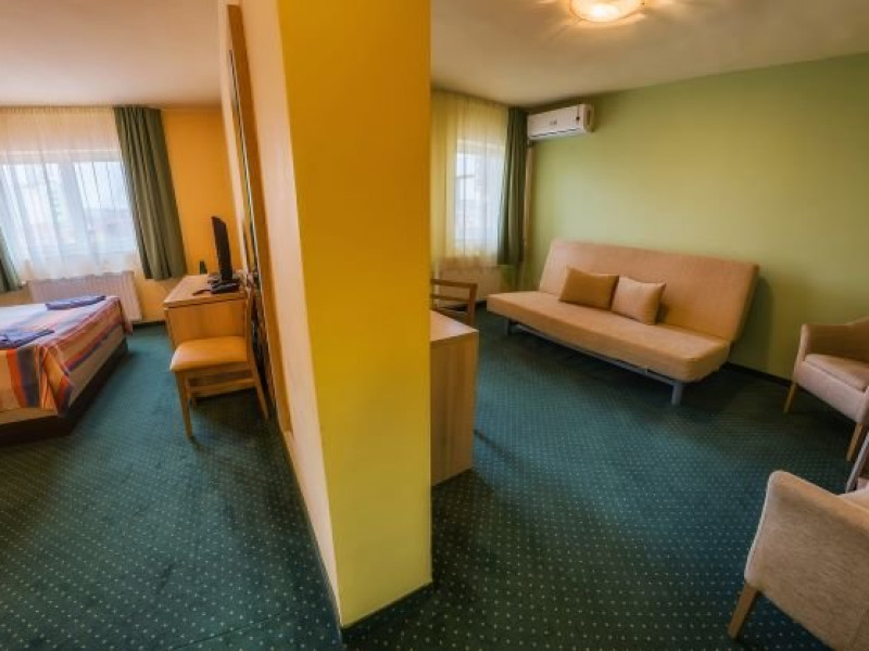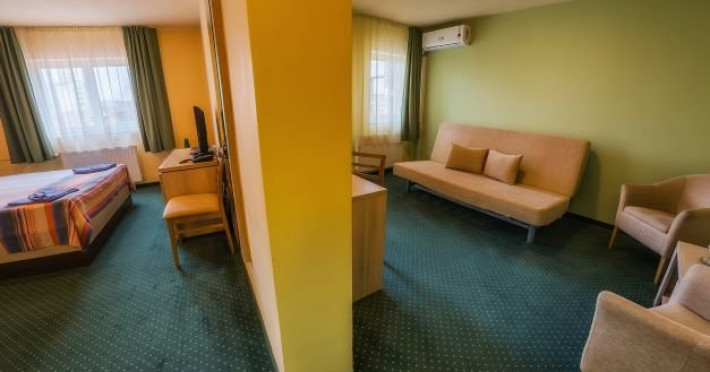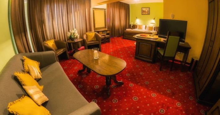 Suite 3 stele: au 45 mp, sunt formate din dormitor cu pat matrimonial si living nedespartite de usa, canapea extensibila, scaune si masuta de cafea, tv, aer conditionat, Wi-Fi, minibar, telefon, baie cu cada si uscator de par.