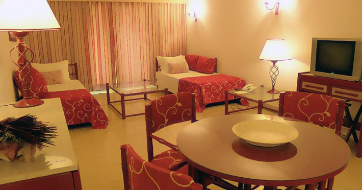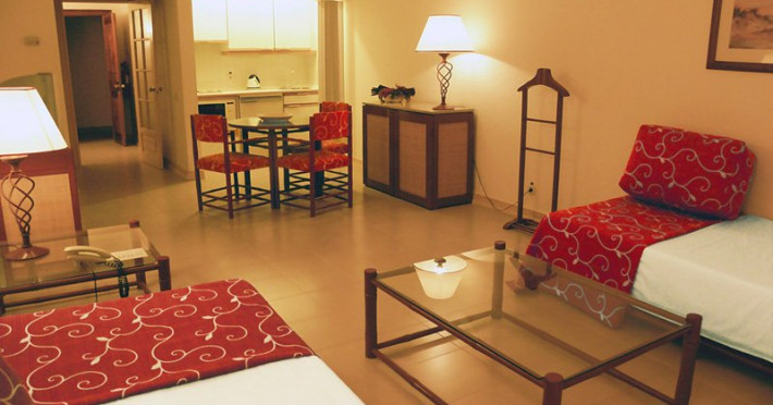 Dotari camere: Camerele sunt spatioase si au o chicineta bine utilata (plita electrica, microunde, aparat pentru cafea, frigider). De asemenea camerele au o zona de living cu masa. In camere exista: seif, televizor, telefon, aer conditionat, baie, balcon.