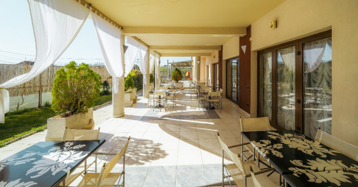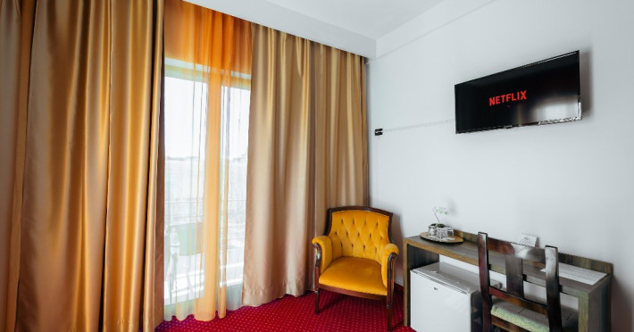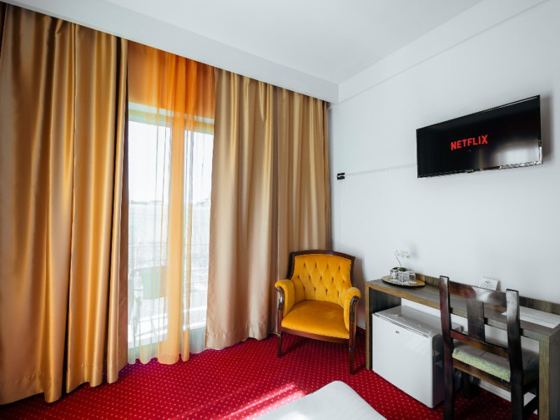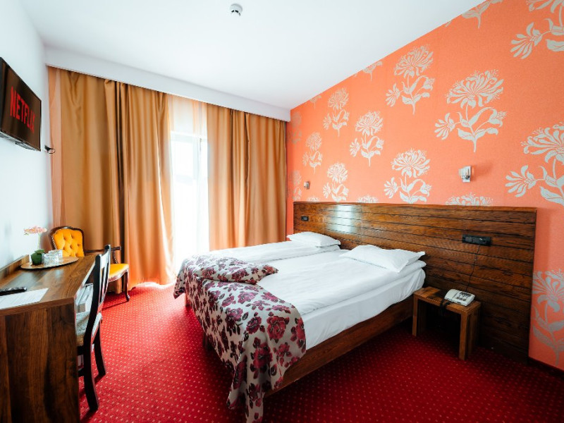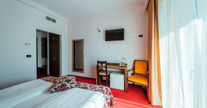 Camere duble: camerele cu design modern, cu terasa, curate, baie cu dus si bideu, aer conditionat, internet wireless, tv smart, cablu, pat dublu, in acest tip de camera se poate pune un pat suplimentar,