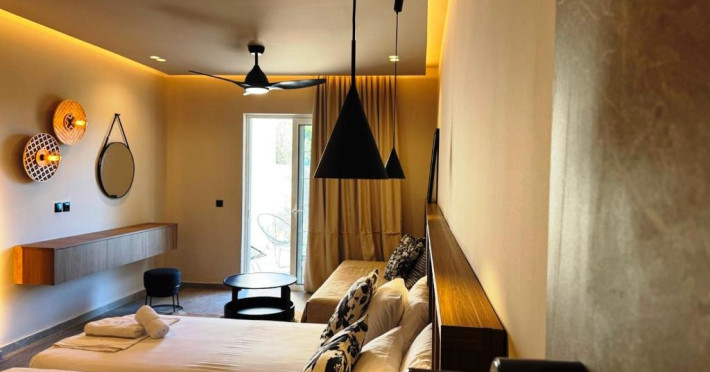 Cazare confortabilă: Argiro Village din Afantou oferă camere de familie cu aer condiționat, băi private și facilități moderne. Fiecare unitate include o chicinetă, balcon cu vedere la grădină și o zonă de luat masa.