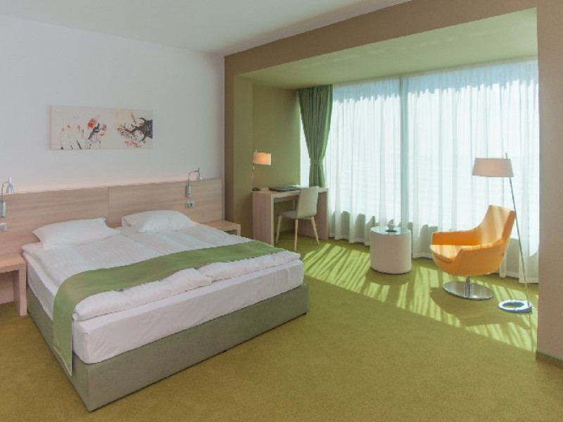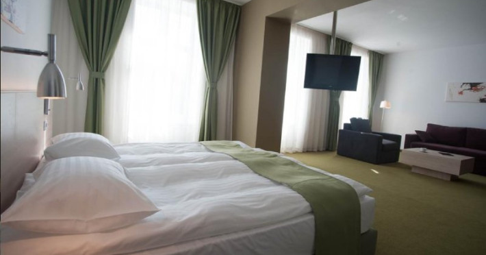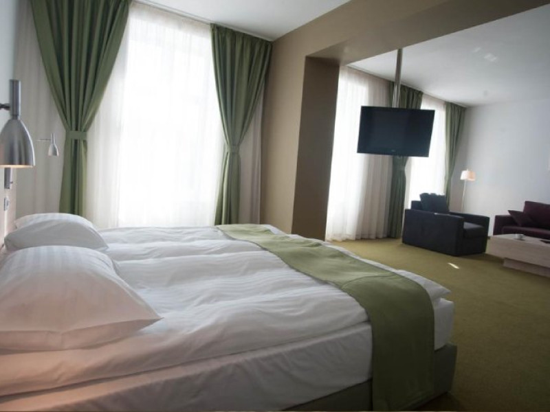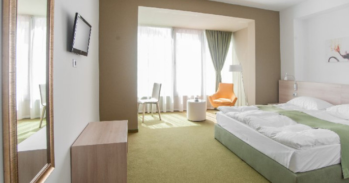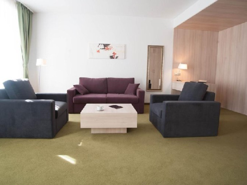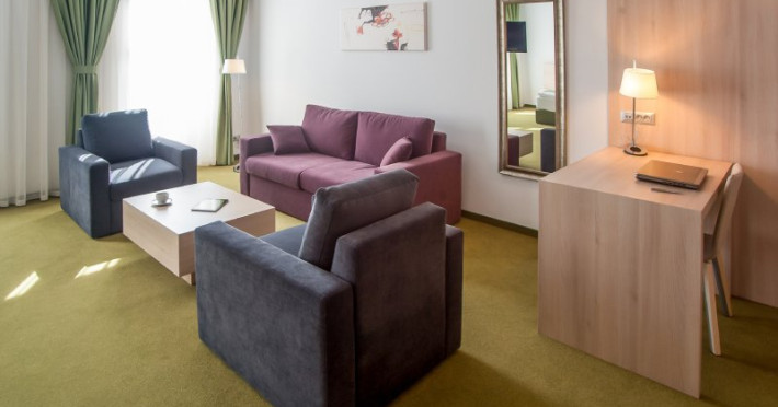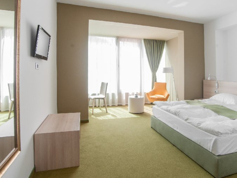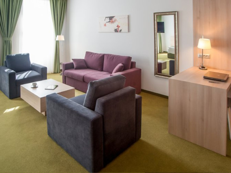 Junior suite: Camera spatioasa (40 m2), vedere la oras, zona de relaxare, canapea extensibila, TV cu ecran plat prin cablu, WiFi gratuit, aparat de ceai, aparat expresso, fier de calcat cu masa de calcat, birou, minibar, uscator de par, seif in camera, articole de toaleta gratuite, aer conditionat cu 4 trepte de turatie, camera de nefumatori.