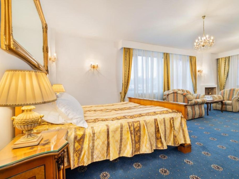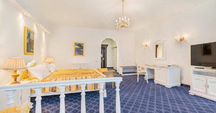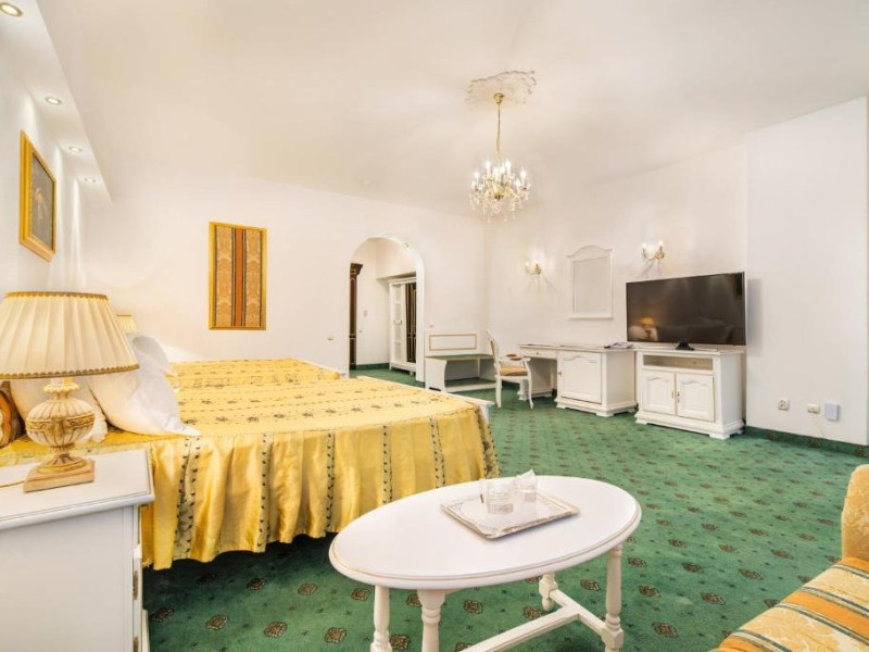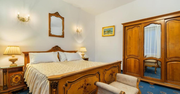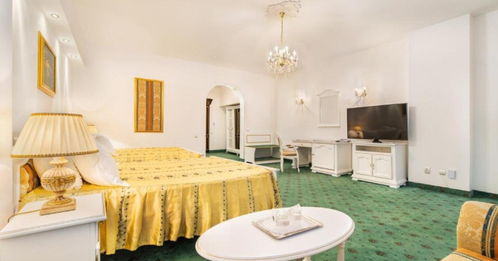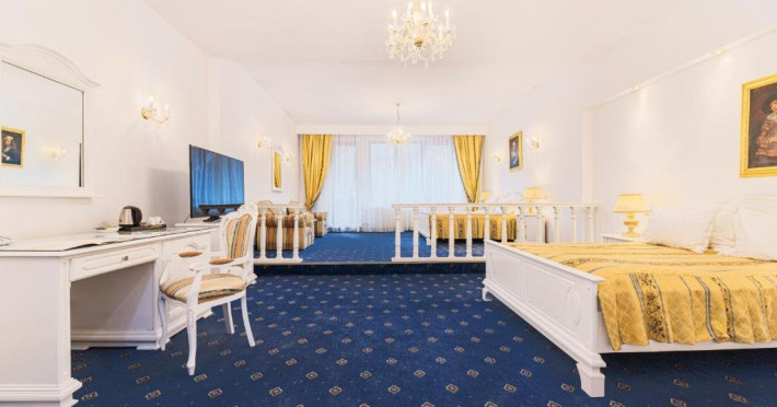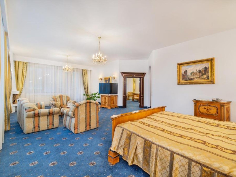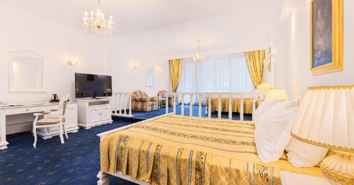 Suita Premier are suprafata de 140 mp si dispune de dormitor si living cu pat matrimonial si o canapea, baie si balcon.