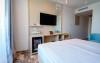 O camera confortabila in care spatiul si designul au fost prioritare. Patul confortabil cu salteaua de dimensiuni de 1.80, culorile inspirate de malul marii si calitatea materialelor folosite ofera linistea necesara pentru relaxare. Lenjeriile din 100% bumbac, precum si celelalte materiale folosite asigura confortul necesar vacantei.