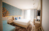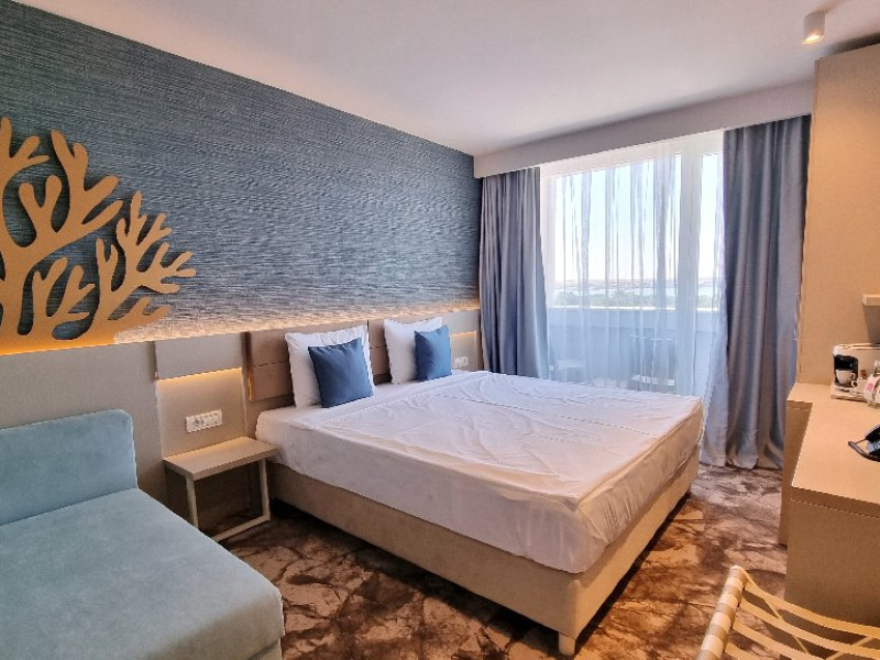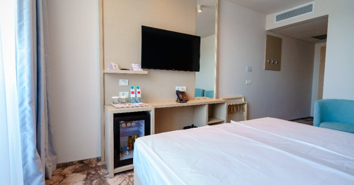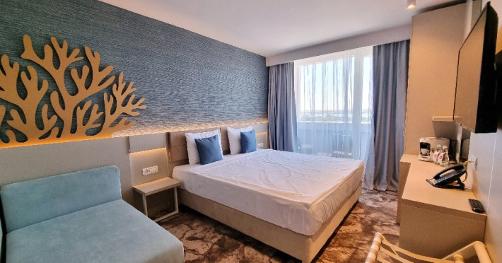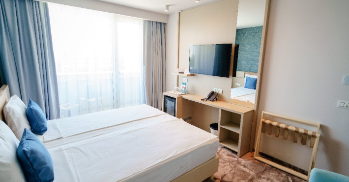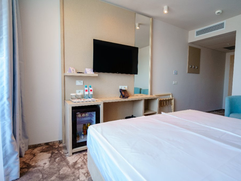 O camera confortabila in care spatiul si designul au fost prioritare. Patul confortabil cu salteaua de dimensiuni de 1.80, culorile inspirate de malul marii si calitatea materialelor folosite ofera linistea necesara pentru relaxare. Lenjeriile din 100% bumbac, precum si celelalte materiale folosite asigura confortul necesar vacantei.