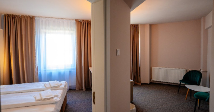 Suita - 4 suite pot acomoda max. 2 adulti si 2 copii pana la 14 ani sau 3 adulti. Ideala pentru doi adulti si doi copii de pana la 14 ani, aceasta suita dispune de toate facilitatile necesare pentru o sedere placuta si memorabila. Dormitorul este echipat cu un pat matrimonial confortabil, in timp ce livingul este mobilat modern si confortabil, perfect pentru momentele de relaxare in familie. Canapeaua extensibila din living ofera un loc ideal pentru copii. Dotari camera: balcon, wi-fi, telefon, baie cu cabina de dus, papuci si halat, minifrigider, tv.