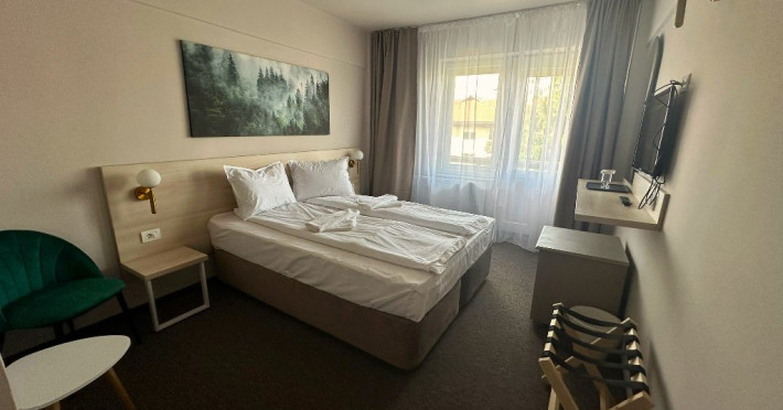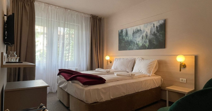 Camera standard - 5 camere matrimoniale 55 camere twin, pot acomoda max. 2 adulti si 1 copil pana la 14 ani. Camera Standard ofera un spatiu confortabil si primitor, perfect pentru o sedere relaxanta. Aceasta camera dispune de un pat matrimonial generos sau doua paturi twin, balcon, wi-fi, telefon, baie cu cabina de dus, papuci si halat, minifrigider, tv.