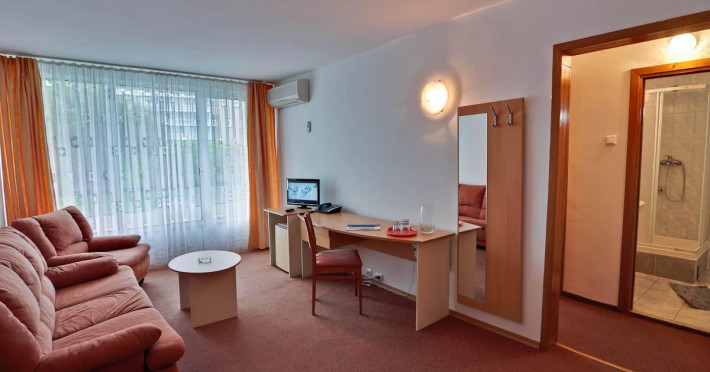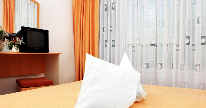 Facilități cameră dublă: pat matrimonial sau twin, baie proprie cu cadă sau duș, aer condiționat, frigider, televizor, uscător de păr.