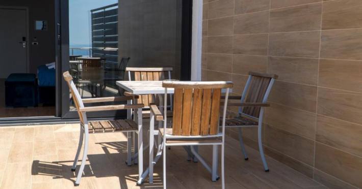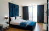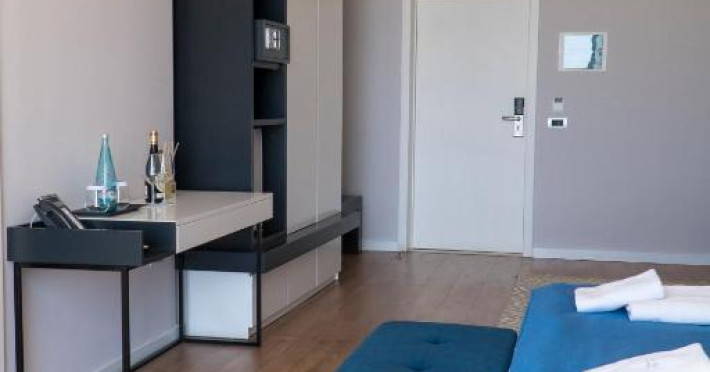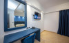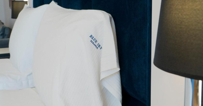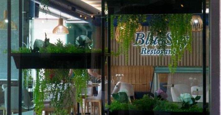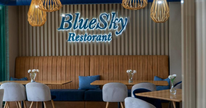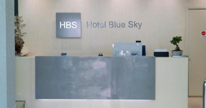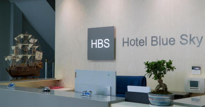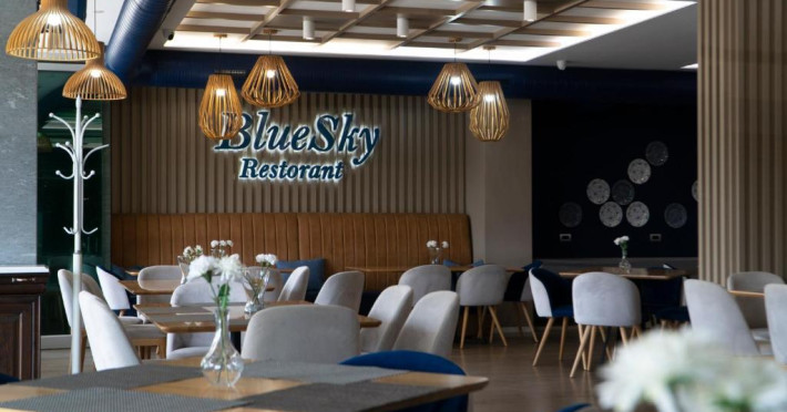 Fiecare cameră de la Blue Sky are aer condiționat, TV cu ecran plat cu canale prin satelit, dulap, minibar și birou. Baia privată are duș, iar balconul mobilat are vedere la munți sau la mare.
