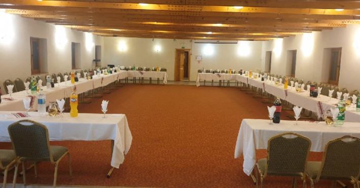 Sala de conferinata are o capacitate de 120 locuri si este dotata cu videoproiector, ecran proiectie, flipchart, sistem de sonorizare.