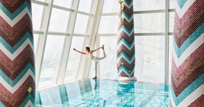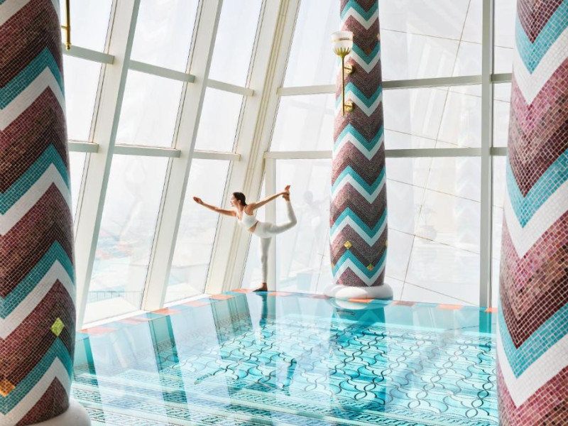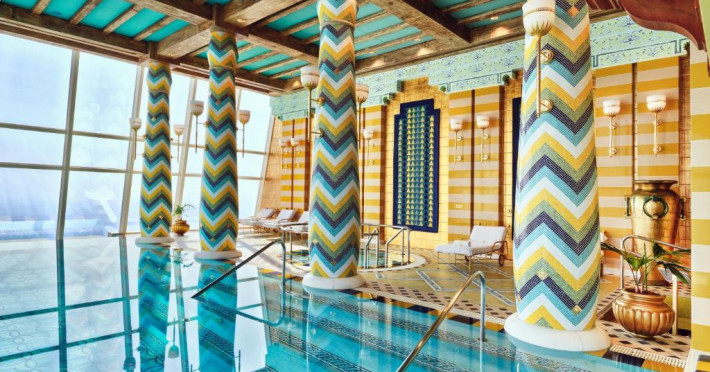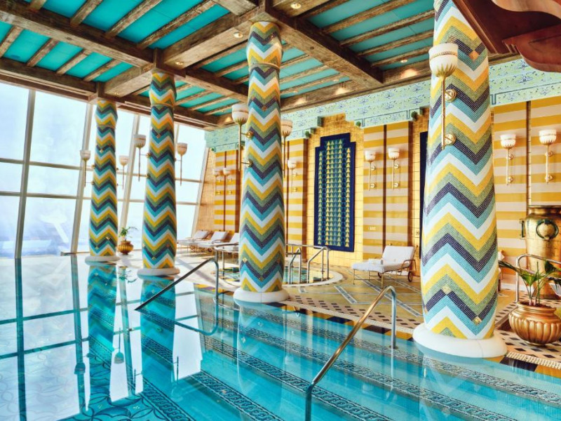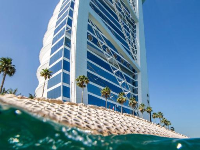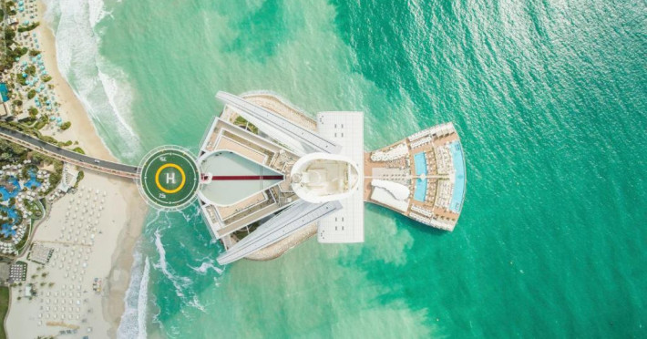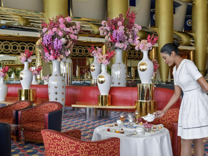 Burj Al Arab Jumeirah se află pe propria sa insulă și pune la dispoziție suite cu vedere la mare, 8 restaurante originale și un centru spa cu servicii complete. Oaspeții pot sosi la proprietate cu autoturisme Rolls Royce cu șofer profesionist sau folosind un serviciu de transfer dedicat, cu elicopterul. Terasa este prevăzută cu 2 piscine, 32 de baldachine de lux, un restaurant și un bar.