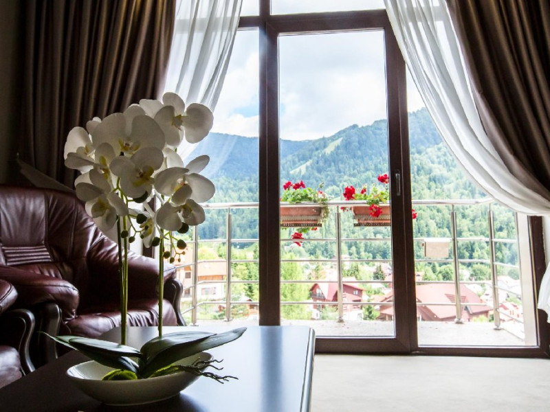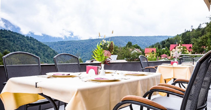 Micul dejun se serveste in salonul de la etajul 1 la hotelului, atat in interior cat si pe terasa cu vedere panoramica.
