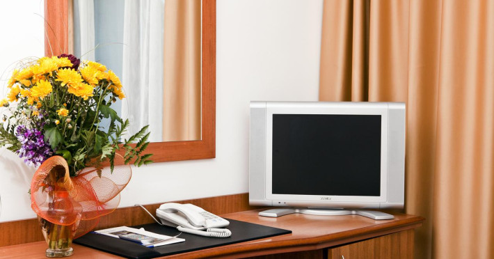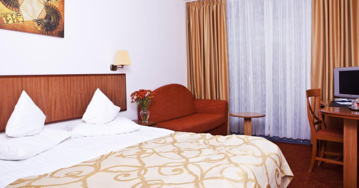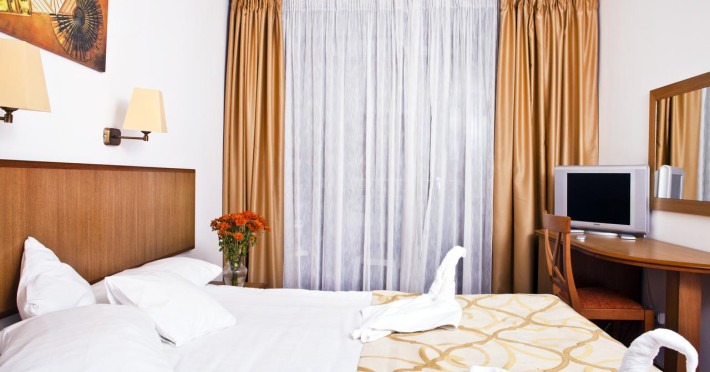 Facilități cameră dublă: pat matrimonial sau twin, baie proprie cu cadă sau duș, aer condiționat, halat de baie, televizor, uscător de păr, internet Wifi.