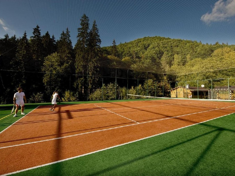 Junior Suite Split - Cele 9 apartamente, cu living-ul despartit de dormitor, sunt perfecte in cazul familiilor cu copii dornice sa beneficieze de o anumita intimitate. Gandite in regim garsoniera, aceste camere beneficiaza de o suprafata foarte generoasa de 54-74 mp. Sunt dotate cu pat matrimonial si canapea neextensibila. Apartamentele sunt distribuite atat in corpul principal de cladire cat si in corpul nou si ofera o panorama deosebita catre statiunea Covasna sau zona de agrement a hotelului. Sunt dotate cu balcon, climatizare, minibar, seif, tv, baie cu cada, uscator de par, halate de baie si papuci de camera.