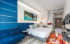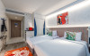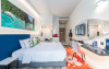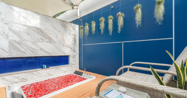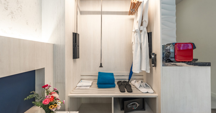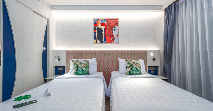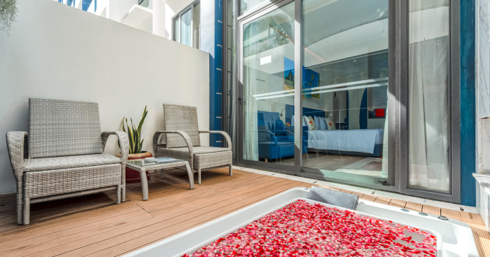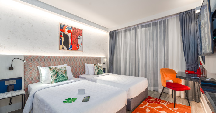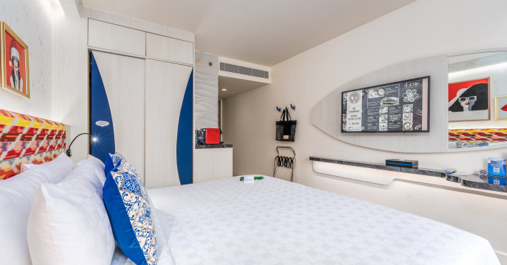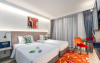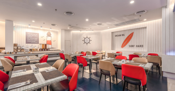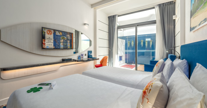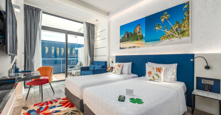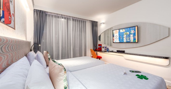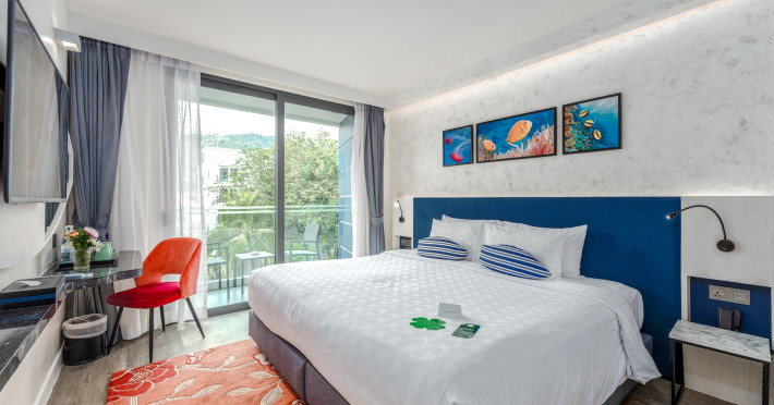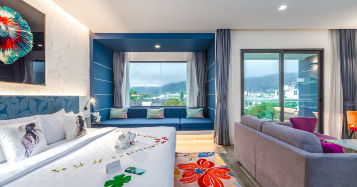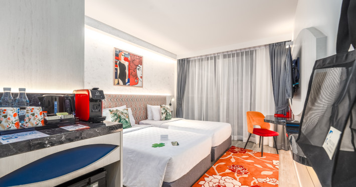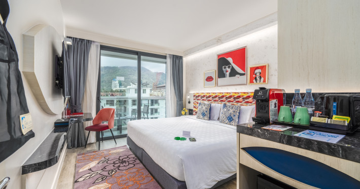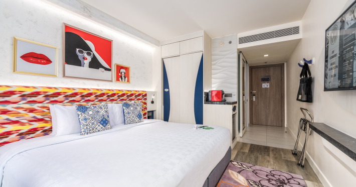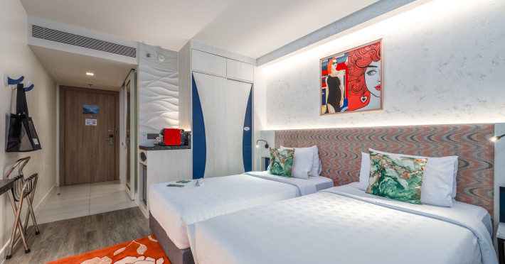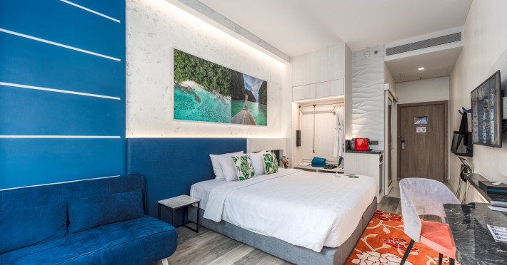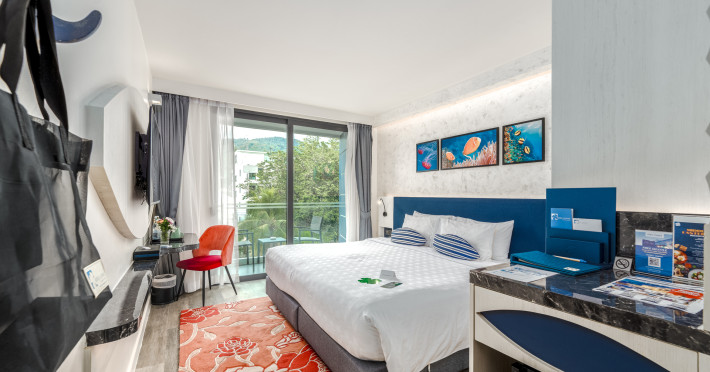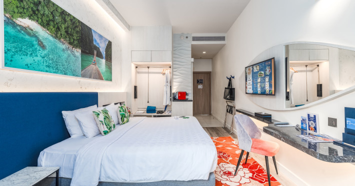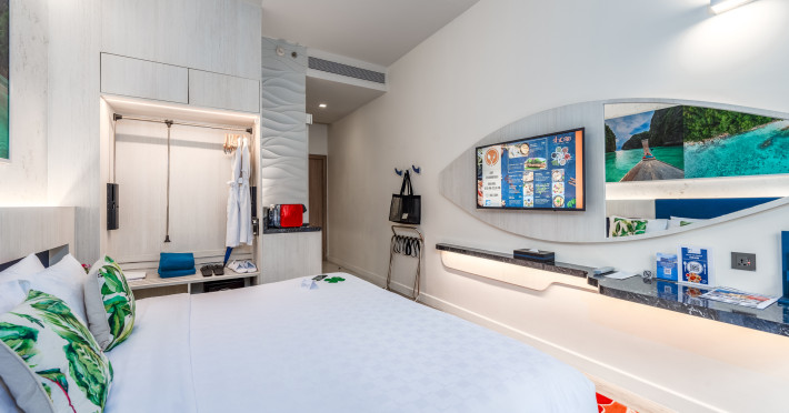 The hotel Hotel Clover Patong Phuket is located approximately 700 m from a public beach and about 500 m from the sea. The nearest bars and restaurants can be found at a distance of around 200 m. The old town is around 16,4 km away. A supermarket and other shops you reach after around 1,7 km. There is a 24h shuttle between the hotel and the airport 24h a day. On the beach are beach towels available. The GPS-verified hotel is equipped with a 24h reception (check-in is possible around the clock), a lobby, Wi-Fi, internet access, a lift, a jacuzzi, showers and changing rooms, a first aid kit, parking spaces (limited) as well as a TV lounge with satellite TV. Outside there is a separate and an integrated children's pool, where sun loungers, sun umbrellas and pool towels are available for free. Furthermore, you can relax outdoors on the roof terrace. You can store your valuables in the safe, and your luggage in the hotel`s storage room. In addition, the hotel Hotel Clover Patong Phuket is video-monitored 24h a day. For very young guests, kid`s chairs, highchairs and cots can be provided. There is also a laundry and ironing service. Ironing equipment can also be borrowed at the hotel. For your comfort the hotel page will ensure you are looked after. If necessary, you can contact the medical centre at any time. Guests at the accommodation can get a wake-up call from the hotel personnel. The energy supply is 220, 110 and 120 Volts. In addition, the hotel sells tickets for excursions. For guests on their honeymoon, the hotel has special offers such as a romantically-decorated room, personalised rooms/articles, rooms with a particularly romantic location and view, romantic dishes in the restaurant, champagne, sparkling wine, a basket of fruit or flowers in the room. In your hotel, a lot of focus is placed on sustainability. This includes the hotel`s own recycling bins, the provision of soap and shampoo dispensers, a central room air-conditioning and environmentally-friendly cleaning. The hotel requires that all guests pay a deposit upon arrival. Euro/Master Card, JCB and Visa are accepted as means of payment. Due to its barrier-free facilities , such as separate, barrier-free entrances, wheelchair accessible rooms, a handrail in the elevator and wheelchair-accessible bathrooms, the hotel is also suitable for wheelchair users. Catering As catering services the hotel offers half board, full board and breakfast only. Breakfast is offered American, continental, from the buffet or à la carte. Enjoy your lunch as a set meal or à la carte with starters, salads and desserts (extras on request). Dinner is also served as a buffet, as a set meal or à la carte with starters, salads and desserts (extras on request). Half board includes breakfast, lunch and dinner. When booking all-inclusive, one welcome drink is included. As part of the all-inclusive service, water (24h) is available around the clock and at no extra charge. For the meals, there are a restaurant (calorie-reduced, gluten-free and vegetarian dishes) and the cafeteria, the pool bar as well as a sky bar. The drinks menu of the hotel includes water, soft drinks, coffee and tea, beer and wine. You can take part in the cooking classes offered by the hotel during your stay. Distances