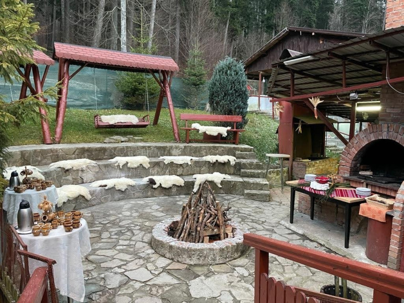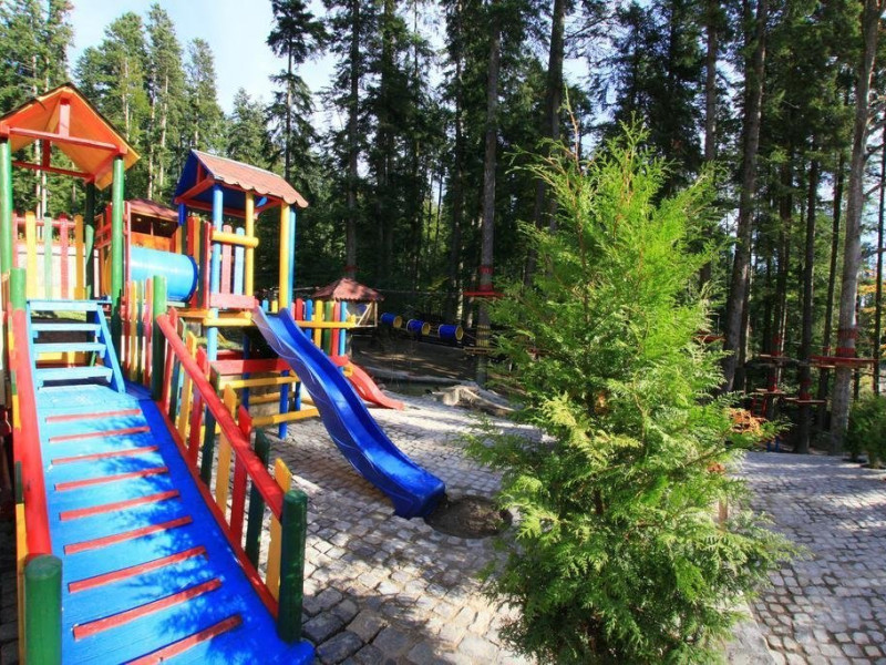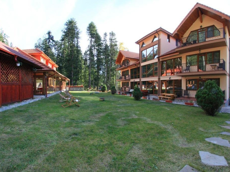 Dotari generale: parcare proprie monitorizata video, internet wireless in tot complexul, pastrare obiecte de valoare, 2 restaurante (cu specific vanatoresc, dar si cu preparate din bucataria romaneasca si gastronomia internationala), loc de joaca interior si exterior pentru copii, terasa cu priveliste asupra masivului Bucegi, zona barbeque, colt cu animalute, parc de aventura (cu trasee de catarare prin copaci, perete de escalada, tir cu arcul, paintball, tiroliene, trasee offroad, biliard, tenis de masa).