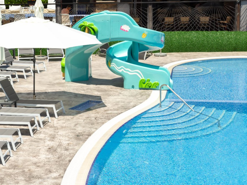 Piscina pentru adulti si copii cu apa incalzita (in perioadele cand este necesar). In jurul piscinei, spatiul este amenajat cu sezlonguri si umbrele.