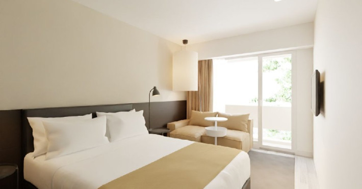 Camere Duble cu balcon si Vedere la Mare: suprafata de 19 mp, situate la etajele superioare, dispun de pat dublu (dimensiune 180 cm) si canapea extensibila (dimensiune 170x 130 cm).