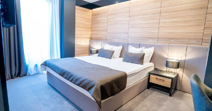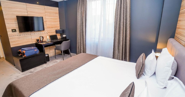 Camera dubla standard - Camera eleganta (20-22mp), pat dimensiune king, birou de lucru, seif pentru laptop, smart TV, minibar, aer conditionat, halat baie si papuci, burete de pantofi, uscator par, facilitati preparare ceai, baie cu dus; Etaj superior; Produse cosmetice;