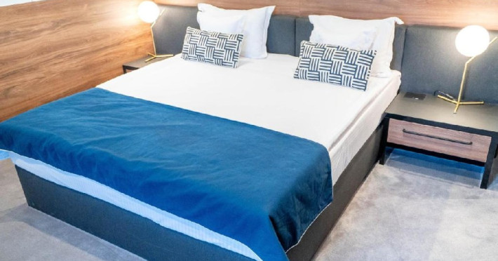 Camera dubla superior - Camera confortabila (23-25mp), pat dimensiune king, birou de lucru, seif pentru laptop, smart TV, minibar, aer conditionat, halat baie si papuci, burete de pantofi, uscator par, facilitati preparare ceai, baie cu dus; Etaj superior; Produse cosmetice;