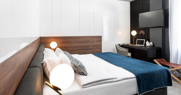 Camera dubla deluxe - Camera spatioasa (26-30 mp), pat dimensiune king, saltea premium, birou de lucru, seif pentru laptop, smart TV, minibar, aer conditionat, halat baie si papuci, uscator par, facilitati preparare ceai, baie cu dus; Etaj superior; Cosmetice Rituals;