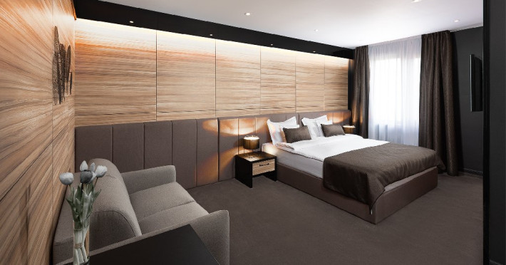 Camera executive - Camera premium (32-35 mp), pat dimensiune king, saltea premium, canapea extensibila, masuta de cafea, birou de lucru, seif pentru laptop, smart TV, minibar, aer conditionat, halat baie si papuci, uscator par, facilitati preparare ceai, baie cu dus; Espressor cu pastile Julius Meinl; Etaj superior; Cosmetice Rituals.