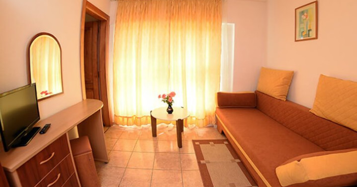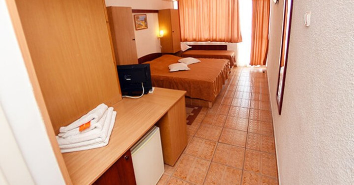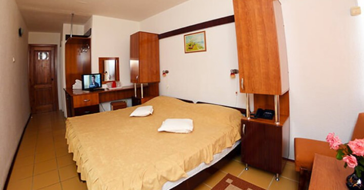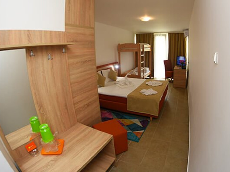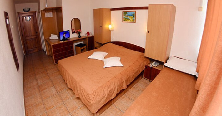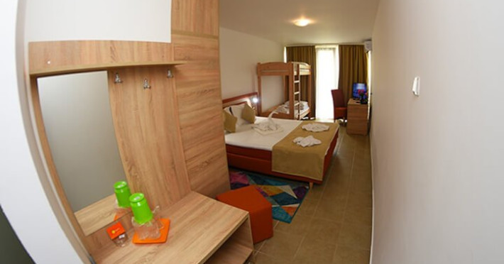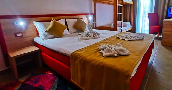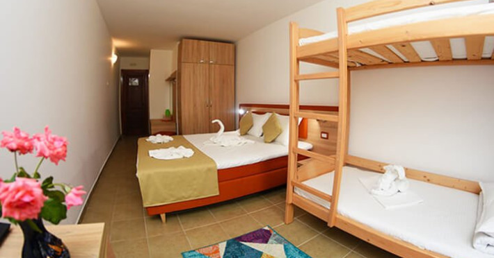 Dubla Family: 34- situate la parterul hotelului, dispun de un pat matrimonial si doua paturi suprapuse.