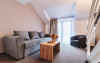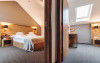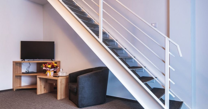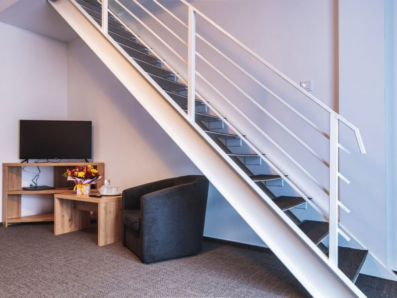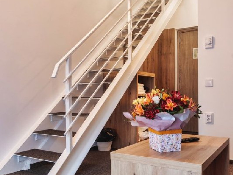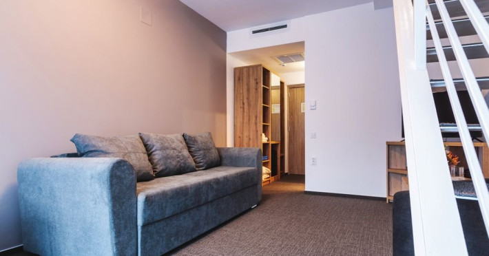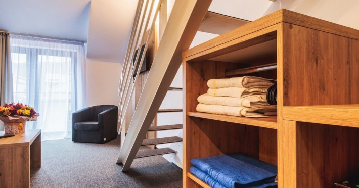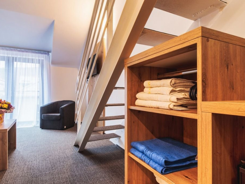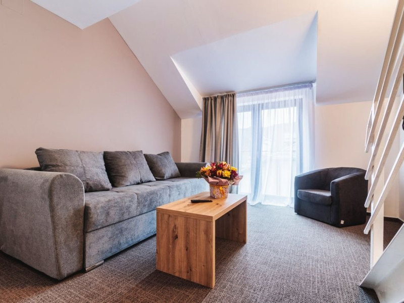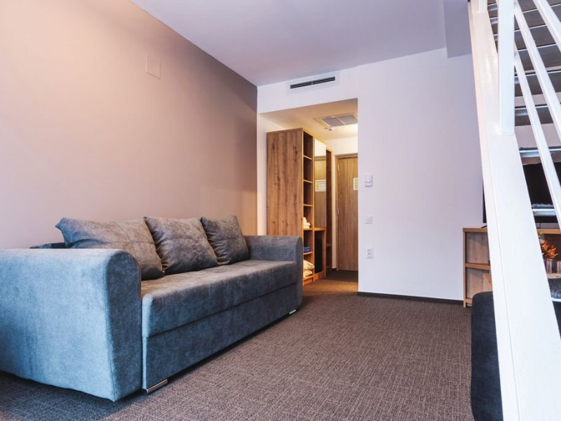 Apartamentele junior sunt dispuse pe doua niveluri: la parter living cu canapea extensibila si la etaj o camera cu pat matrimonial. Exista o singura baie, situata la parter.